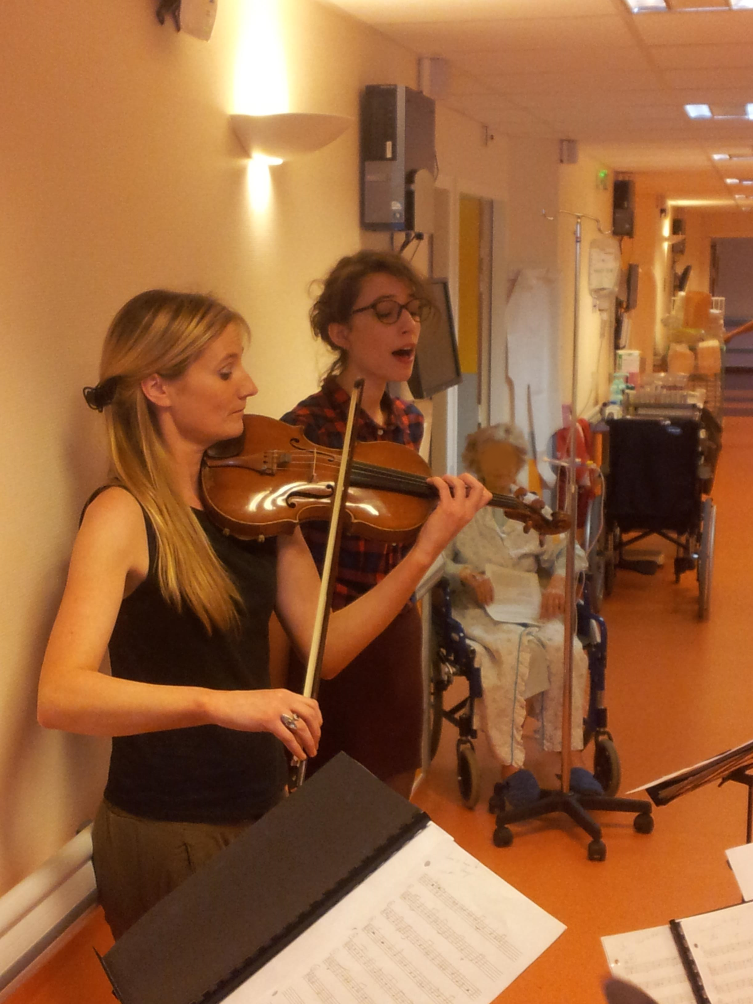 « La musique au chevet » est pour nous essentiel à l’hôpital pour les personnes qui ne peuvent pas quitter leur étage ou leur chambre. Nous venons alors à eux, à leur chevet. En intervenant en très petit effectif (un ou deux musiciens) nous touchons tout de suite une autre dimension dans un moment plus intime. Nous créons alors un temps suspendu riche en échanges musicaux, verbaux et d’émotions…